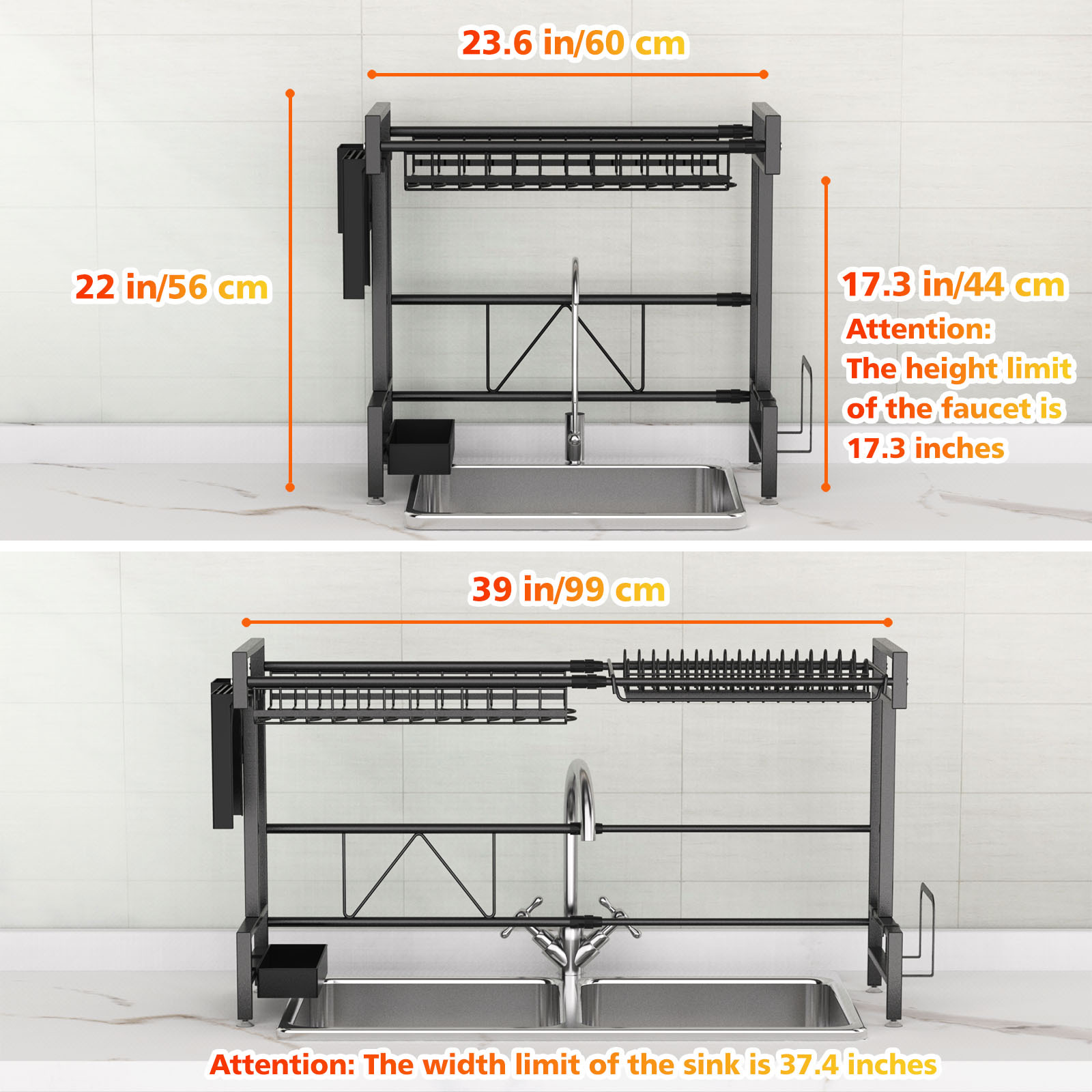 - 【Adjustable Dish Rack】The DUCHIFAD over the sink dish drying rack with adjustable width design ( 23.6”-39”) , fits perfectly in most kitchen with single or double sinks. (Note: Please measure your sink size is ≤ 39″, the height of the faucet ≤ 17.3″ and countertop-cabinet distance ≥ 22″ )